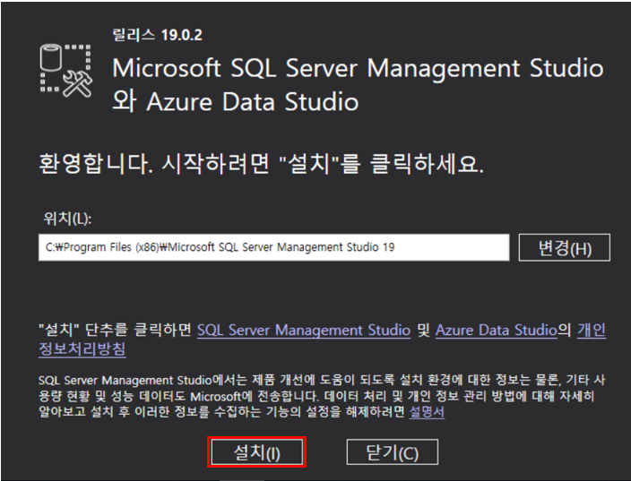바탕화면의 SSMS 설치 파일을 더블클릭한 후 초기화면에서 '설치'를 누릅니다.