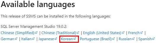 한글 버전의 SSMS를 다운로드 받기 위해서는 스크롤을 아래로 조금만 내리면 Korean 버전의 SSMS 설치파일 다운로드 링크가 있습니다.