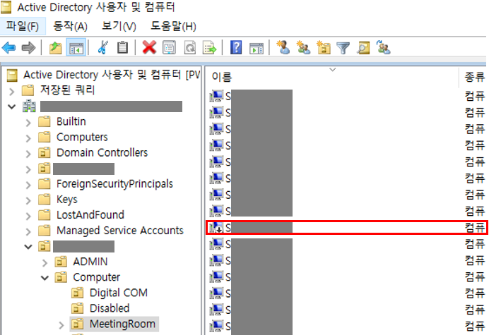 Active Directory 사용자 및 컴퓨터로 진입하여 아래와같이 비활성화된 컴퓨터 개체를 확인할 수 있습니다.