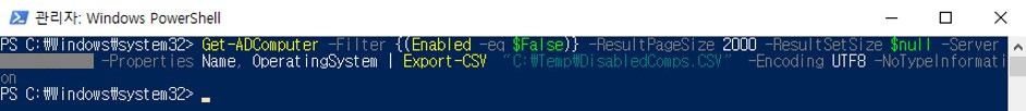 Get-ADComputer -Filter {(Enabled -eq $False)} -ResultPageSize 2000 -ResultSetSize $null -Server DC의 IP 또는 Hostname -Properties Name, OperatingSystem | Export-CSV “C:\Temp\DisabledComps.CSV” -Encoding UTF8 -NoTypeInformation