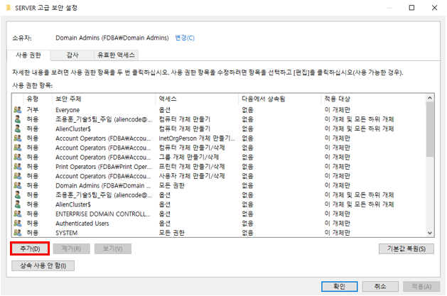 4. 사용 권한에서 [추가]를 클릭합니다.