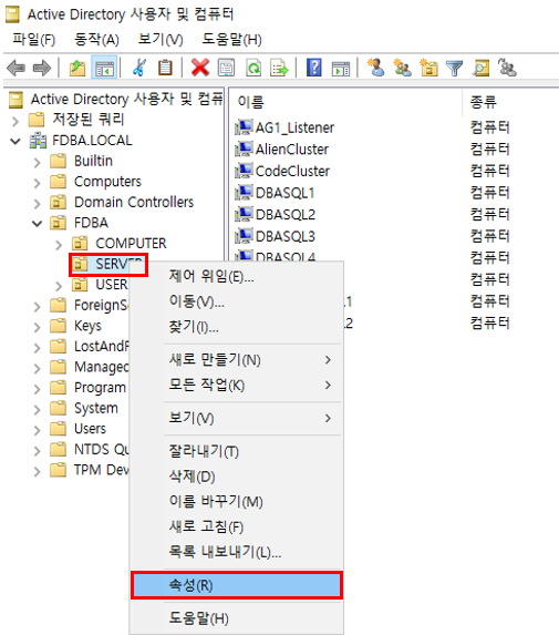 2. 클러스터 구성을 위한 컴퓨터(서버) 개체가 포함된 OU를 선택하고 속성을 클릭합니다.