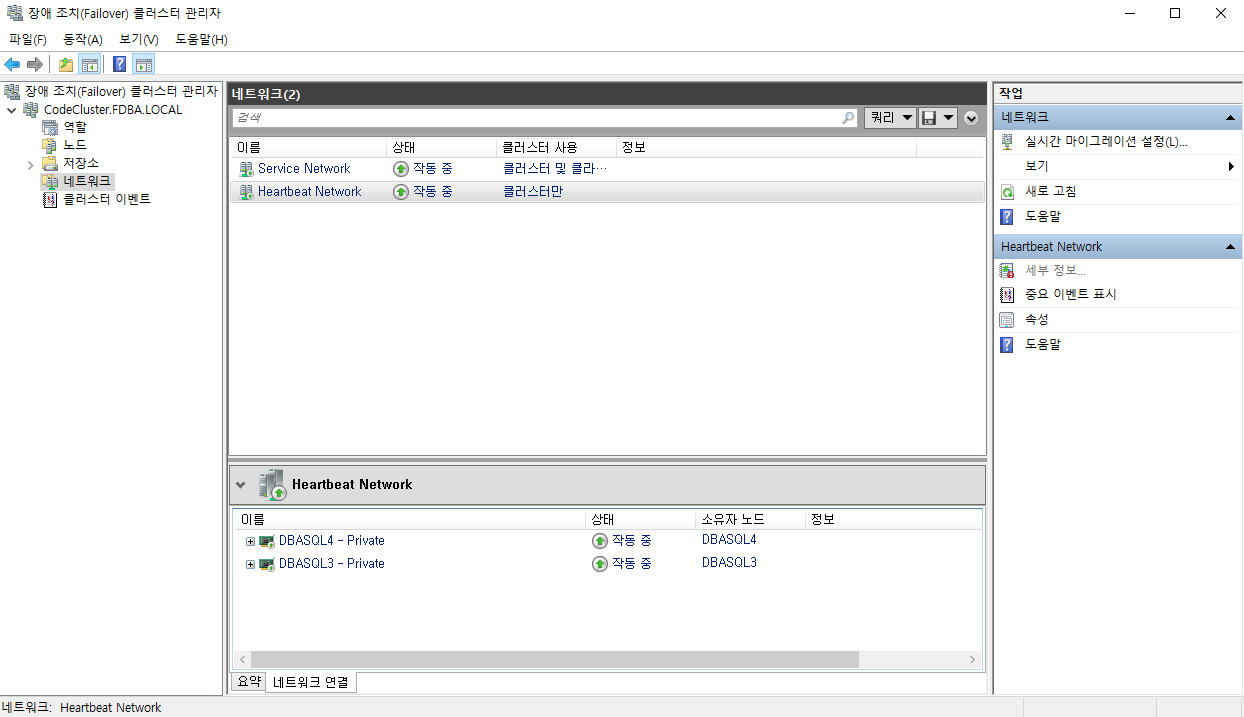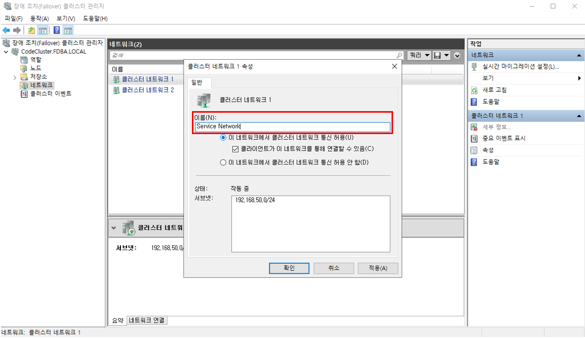 8. 관리의 편의성을 위해서 클러스터 네트워크 1, 2의 이름을 Service Network와 Heartbeat Network로 변경합니다.