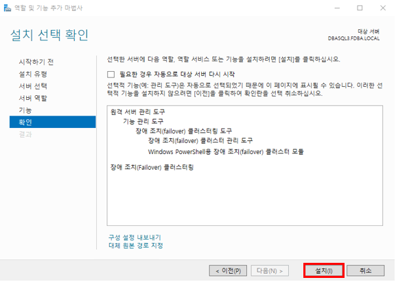 장애 조치 클러스터 기능 추가 (2개의 SQL Server에서 모두 진행)