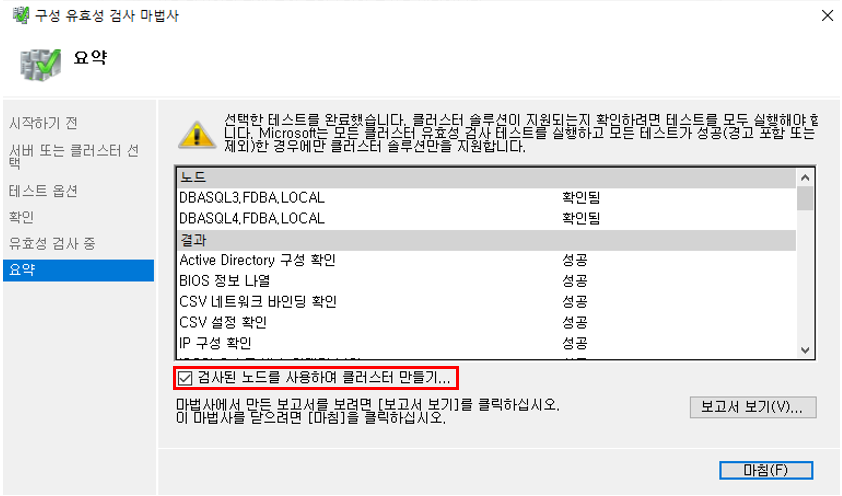 9. 검사된 노드를 사용하여 클러스터 만들기의 체크박스를 체크한 후 마침을 눌러 클러스터 만들기 마법사를 실행합니다.