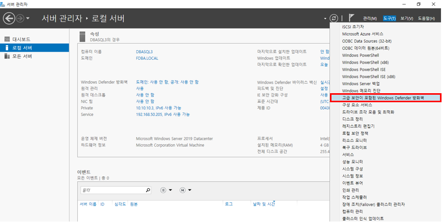 1. 서버 관리자 > 로컬 서버 > 도구 > 고급 보안이 포함된 Windows 방화벽을 선택합니다.