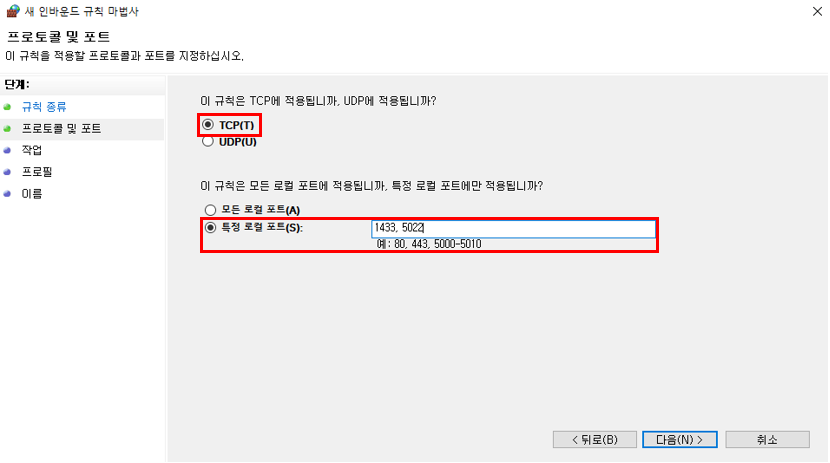 4. 프로토콜 및 포트에서 TCP, 특정 로컬 포트에서 1433, 5022 포트를 입력하고 다음을 클릭합니다.