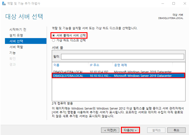 2. 서버 선택에서 서버 풀에서 서버 선택을 체크하고 다음을 클릭합니다.