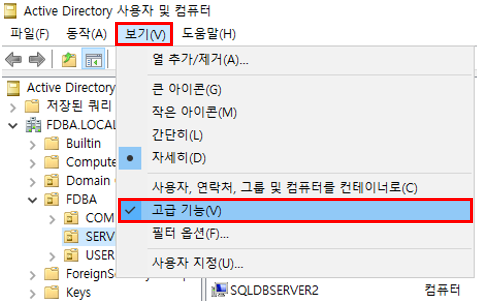 1. AD 사용자 및 컴퓨터 관리 도구를 실행하고 보기 > 고급 기능을 체크합니다.