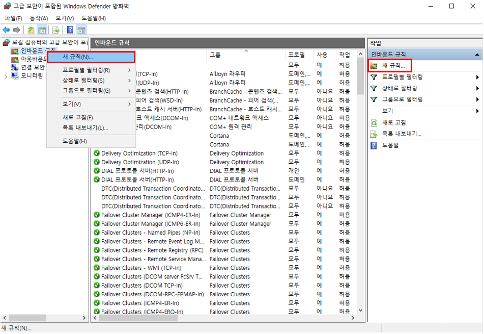 2. 고급 보안이 포함된 Windows 방화벽 도구에서 인바운드 규칙 > 새 규칙을 선택합니다.