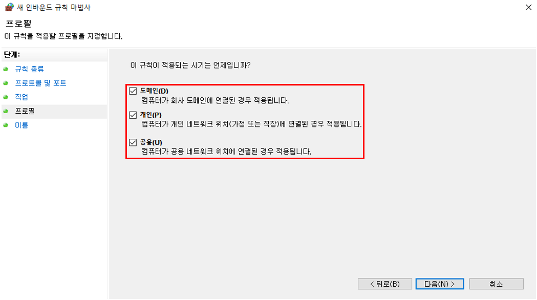 6. 프로필에서 모두 선택된 상태에서 다음을 클릭합니다.