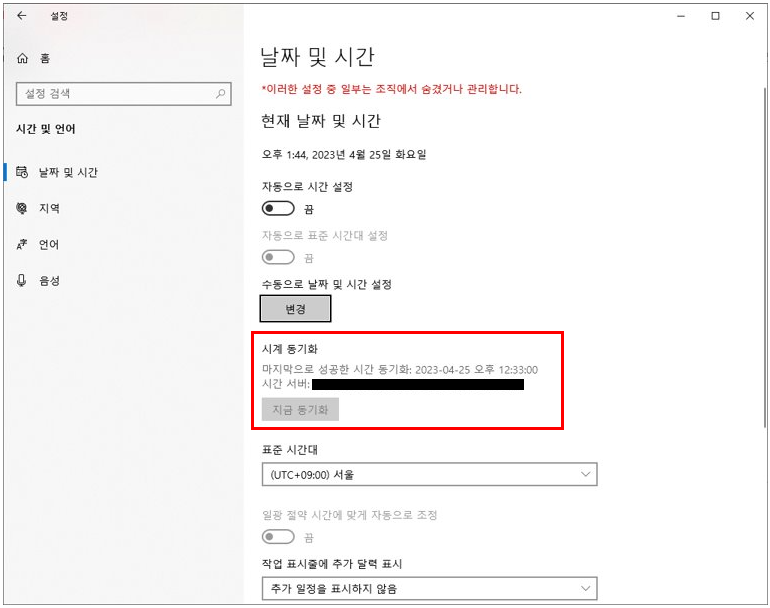 날짜 및 시간 탭에서 시계 동기화 부분을 주목합니다.