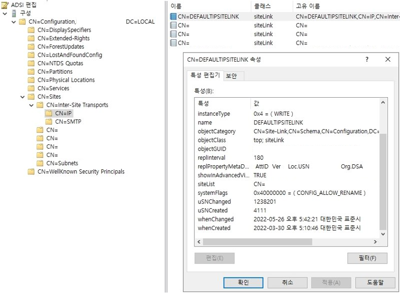이후 CN=IP 디렉토리 안에 있는 siteLink 클래스를 우클릭 또는 더블클릭하여 속성 편집기로 들어옵니다.