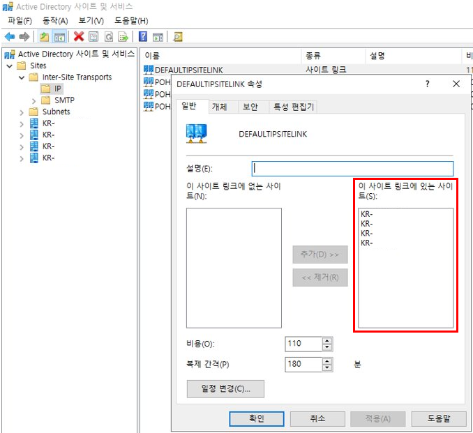 위 설정을 CN=IP 디렉토리에 들어있는 모든 siteLink에 적용합니다.